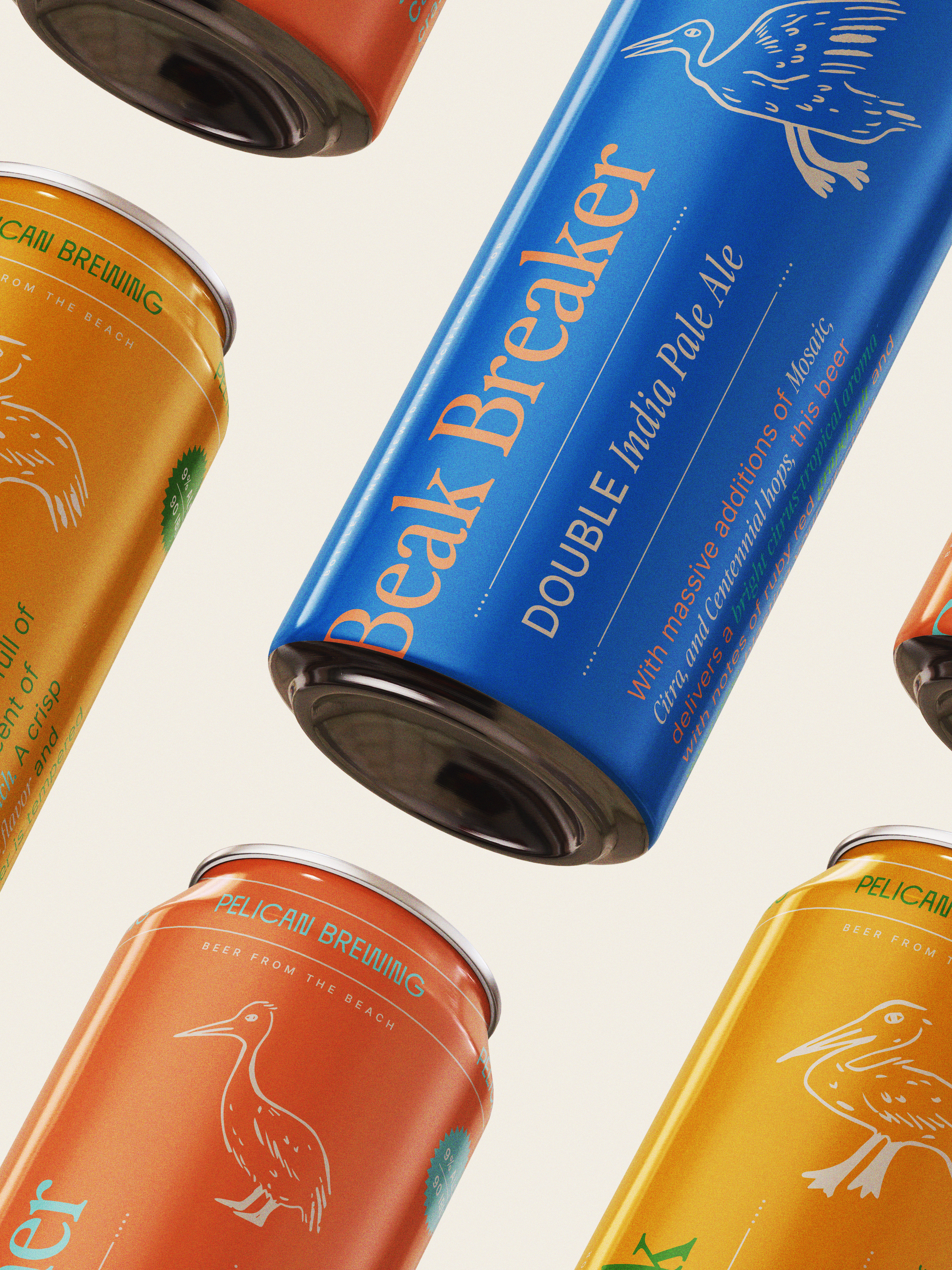 A conceptual redesign of can and bottle packaging for Pelican Brewing company, completed in 2022. Featuring original illustrations and custom typography, this concept draws on the colors, spirit, and whimsy of Pacific City, home to the brewery.
